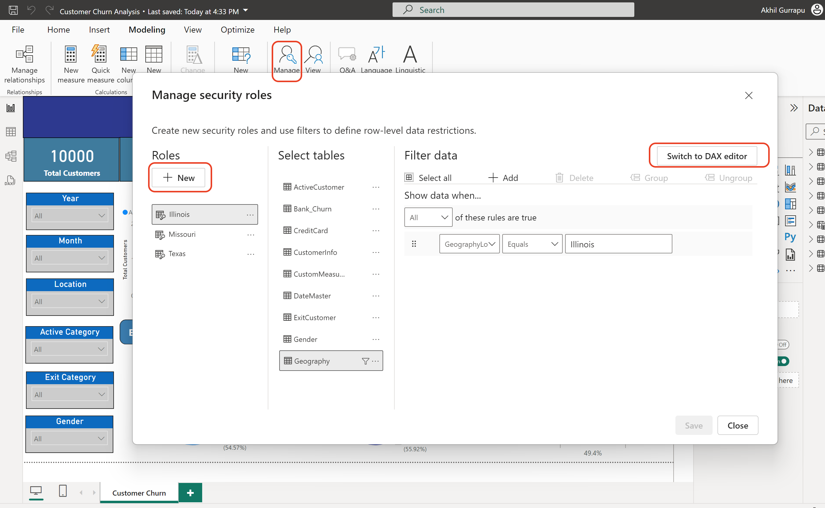 For more complex RLS filters, such as those using dynamic rules like username() or userprincipalname(), switch to the DAX editor.